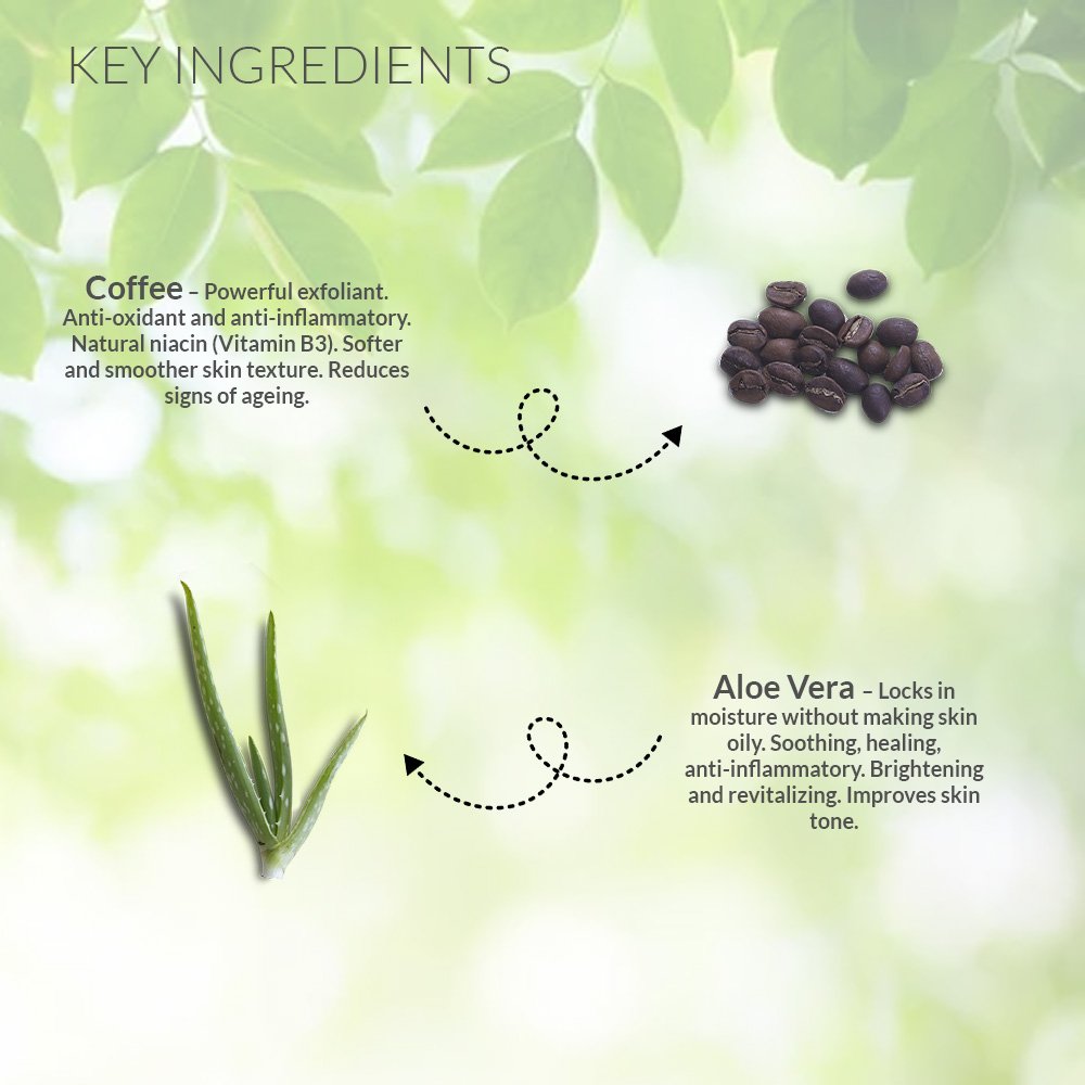 - Coffee – Powerful exfoliant. Anti-oxidant and anti-inflammatory. Natural niacin (Vitamin B3). Softer and smoother skin texture. Reduces signs of ageing.